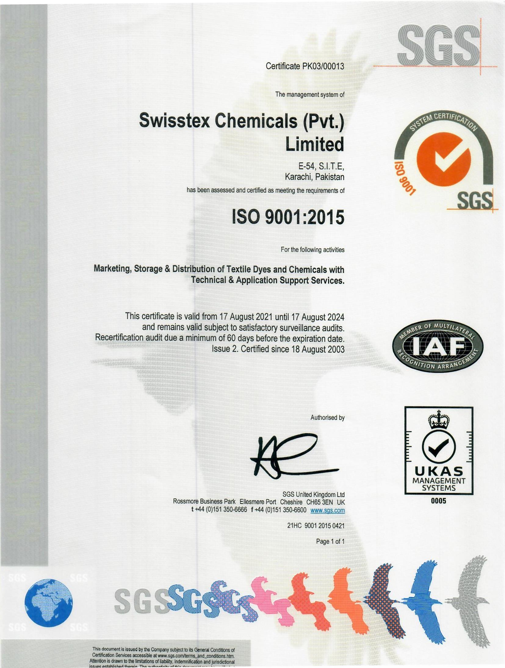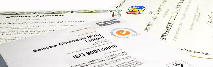 Swisstex Chemicals has received the following Certifications and Accreditations due to our diligent pursuit of quality in product, services and procedures