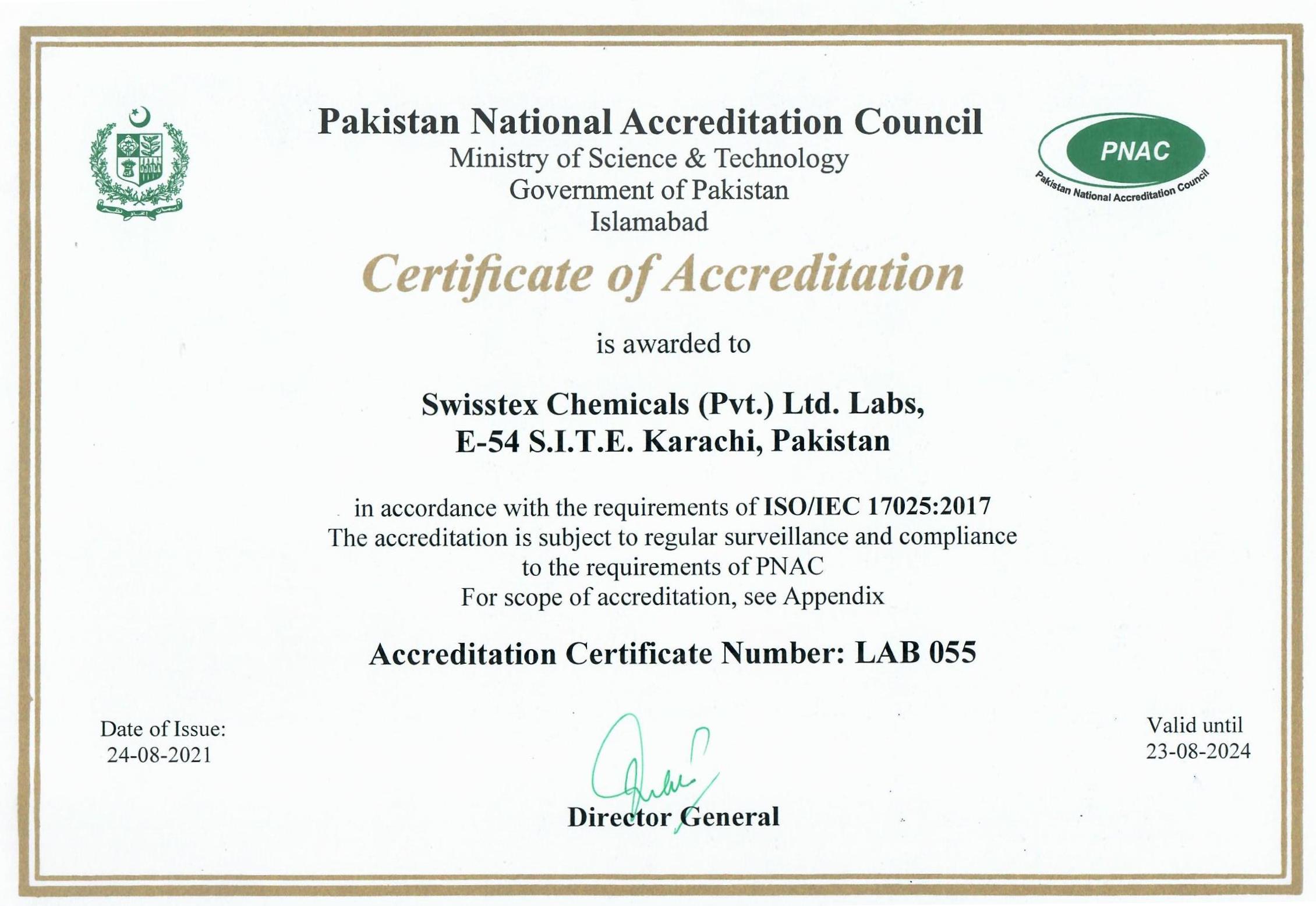 Accreditation Certificate Number: LAB 055, & Issued on 24 Aug 2021 and valid until 23 Aug 2024 |