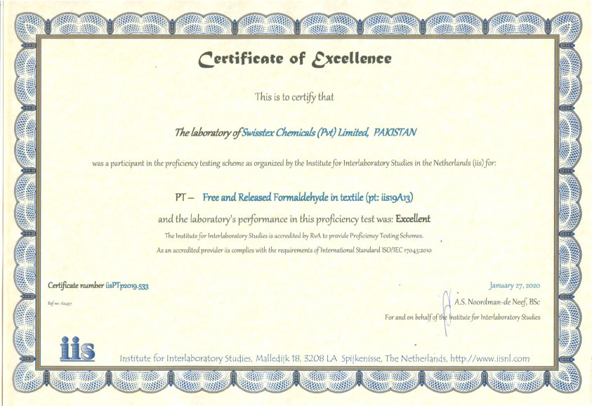 Certification of Excellence - Formaldehyde Proficiency TestingBy IIS - Institute of Interlaboratory studies Netherlands for PT in Free Formaldehyde |